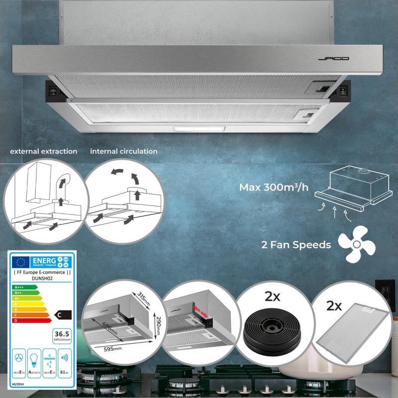 341 - 200 : Jago- Uittrekbare afzuigkap, 59,5 cm, met vetfilter en koolstoffilter