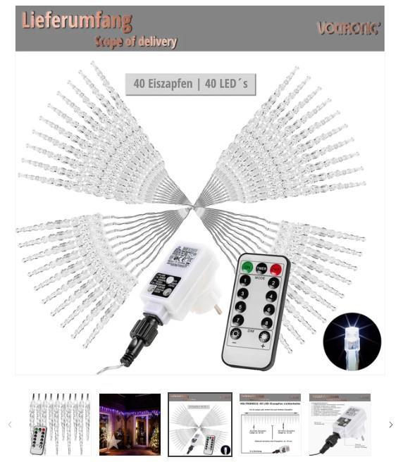 De VOLTRONIC ijspegels hebben 40 LED's, de kleur van de toevoerleiding is transparant. Dankzij de beschermingsklasse IP 44 zijn de lichtkettingen ook geschikt voor buitengebruik. De energiebesparende LED's verbruiken slechts 2 Watt (10mA). Optioneel zijn onze ijspegellichtjes verkrijgbaar met afstandsbediening, timer, 8 programma's en dimfunctie.