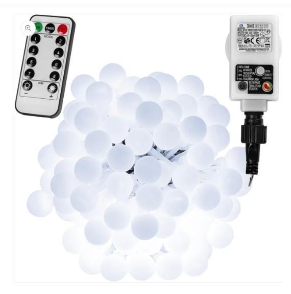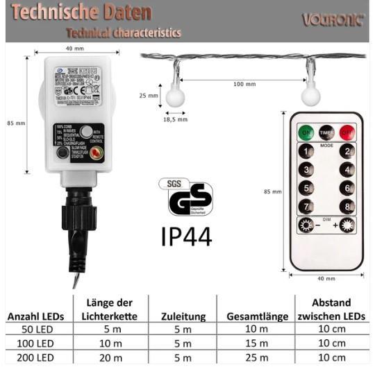 De VOLTRONIC LED partylichtketting met transparante kabel is dankzij beschermingsklasse IP 44 geschikt voor binnen- en buitengebruik. De LED-lampen zijn zeer zuinig met 1,5 watt (10mA) voor 50 LED's, 3 watt (10mA) voor 100 LED's en 3 watt (5mA) voor 200 LED's. Onze kerstverlichting heeft een kabel van 5 m naar de adapter en een afstandsbediening. Met deze afstandsbediening kun je de timer, 8 lichtstanden en de dimmerfunctie bedienen.