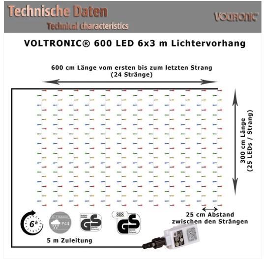 Het VOLTRONIC LED-lichtgordijn met transparante kabel is dankzij beschermingsklasse IP 44 geschikt voor binnen- en buitengebruik. De LED-lampen zijn met 4,5 Watt (5mA) voor 300 LED's en 9 Watt (5mA) voor 600 LED's zeer zuinig. Onze kerstverlichting heeft een kabel van 5 m naar de adapter en een afstandsbediening. Met deze afstandsbediening kun je de timer, 8 lichtstanden en de dimmerfunctie bedienen.