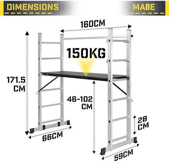 Klaar voor je volgende project? Met de Timbertech Steiger ben je perfect uitgerust voor elke uitdaging, zowel binnen als buiten. Deze robuuste en veelzijdige rolsteiger is ontworpen om maximale veiligheid en flexibiliteit te bieden, zodat je elke klus efficiënt en zonder zorgen kunt uitvoeren. Belangrijkste kenmerken: Robuust: Draagt tot 150 kg – Ideaal voor veeleisende werkomgevingen waar zware lasten geen probleem mogen zijn. Bestendig: Gemaakt van corrosiebestendig aluminium – Geschikt voor alle weersomstandigheden en klaar voor zowel binnen- als buitentoepassingen. Flexibel: In hoogte verstelbaar – Pas de werkhoogte eenvoudig aan jouw behoeften aan voor maximale flexibiliteit. Veilig: Uitgerust met leuningen en antislipvoetjes – Voor optimale stabiliteit en veiligheid tijdens het werk. Praktisch: Voorzien van transportwielen – Gemakkelijk te verplaatsen en te transporteren naar verschillende werkplekken. Technische Specificaties: Afmetingen Steiger (BxDxH): ca. 160 x 66 x 171,5 cm Verstelbare Werkhoogte: ca. 46 - 102 cm Platform Afmetingen (LxB): ca. 148 x 41 cm Max. Draagvermogen: 150 kg Materiaal: Corrosiebestendig aluminium, multiplex platform, PVC-voeten, ijzeren staven Gewicht: ca. 15 kg Extra Functies: Antislipplatform voor extra grip Geribbelde sporten voor meer veiligheid Transportrollen voor eenvoudig verplaatsen Leuning voor extra stabiliteit
