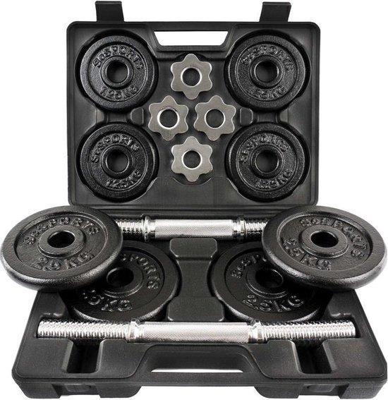 369 - 25 : 21 kg Halterset - Dumbbell Set met koffer - korte halterstangen - Gietijzer - Gewichten