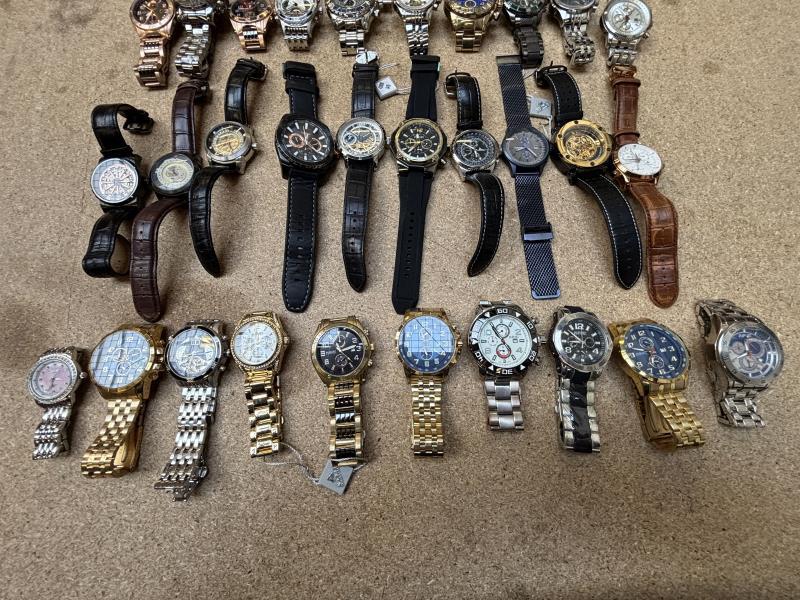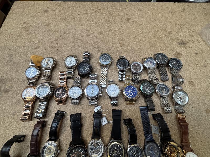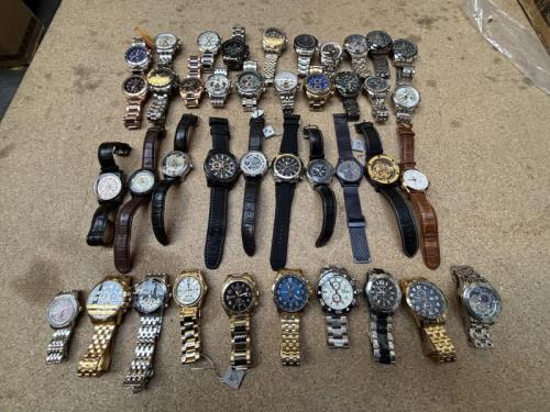1 doos met ca. 40 stuks horloges w.o August Steinervan diverse kleuren en materialen. Dit betreft een partij horloges die deels retourgoederen zijn en deels ter reparatie aangeboden zijn. Werking onbekend.