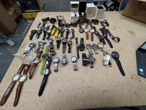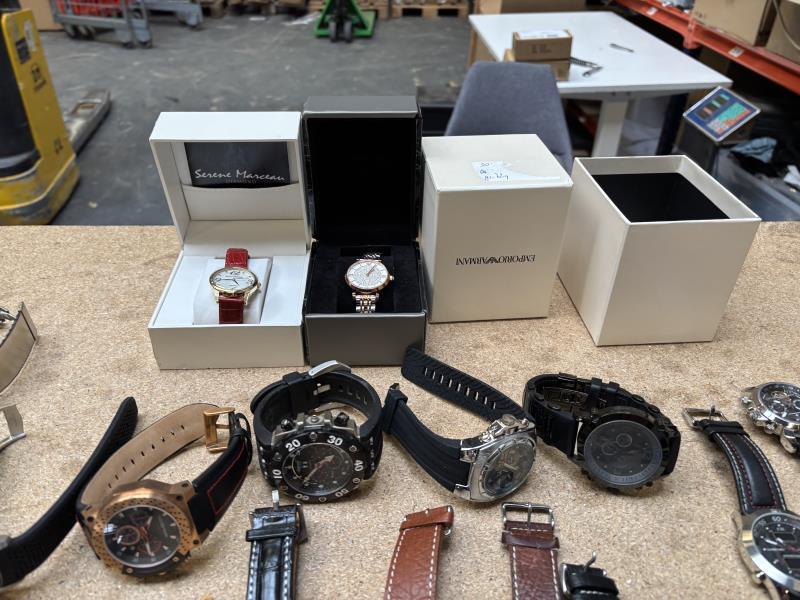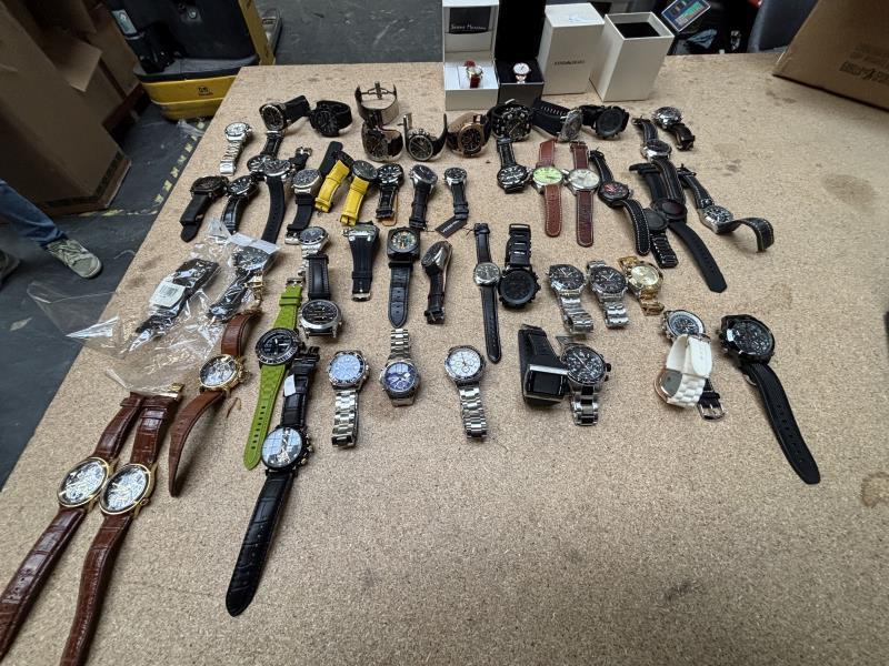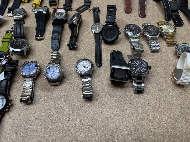 1 doos met ca. 50 stuks horloges w.o. Veloci Tech, August Steiner, Armanai, van diverse kleuren, materialen en merken. Dit betreft een partij horloges die deels retourgoederen zijn en deels ter reparatie aangeboden zijn. Werking onbekend.