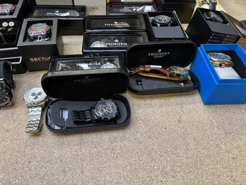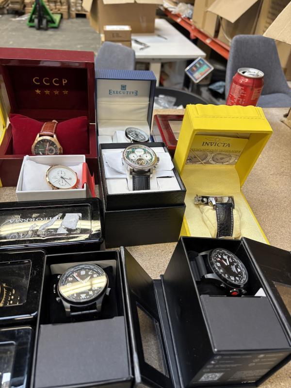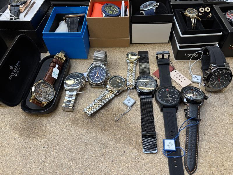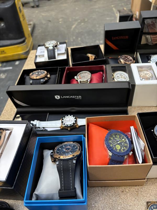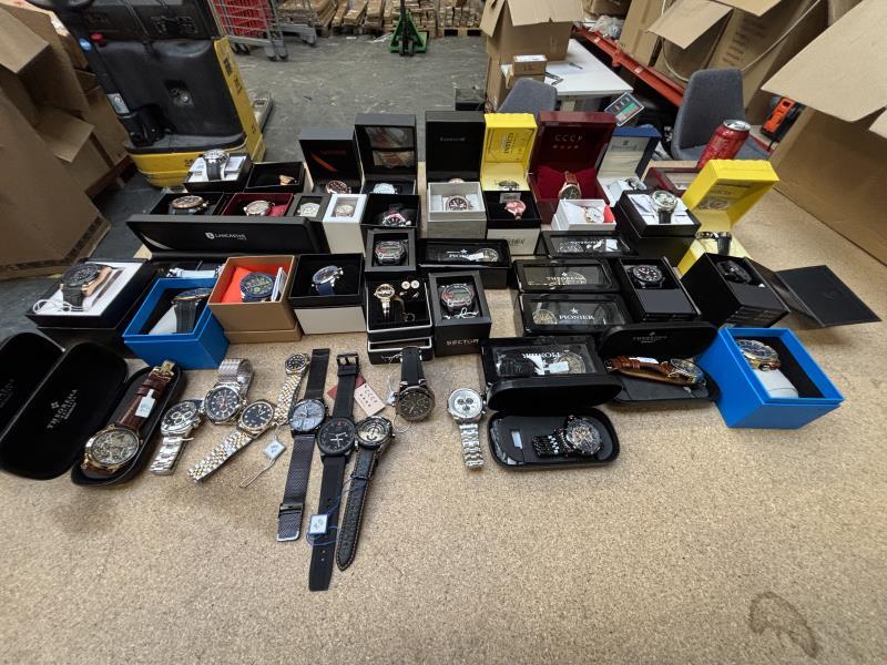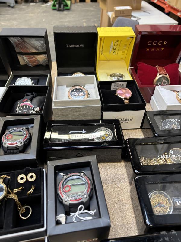 1 doos met ca. 50 stuks horloges w.o. Earnshaw, Lancaster, Pionier, CCCPA, Akribos, Invicta van diverse kleuren, materialen en merken. Dit betreft een partij horloges die deels retourgoederen zijn en deels ter reparatie aangeboden zijn. Werking onbekend.