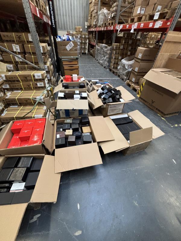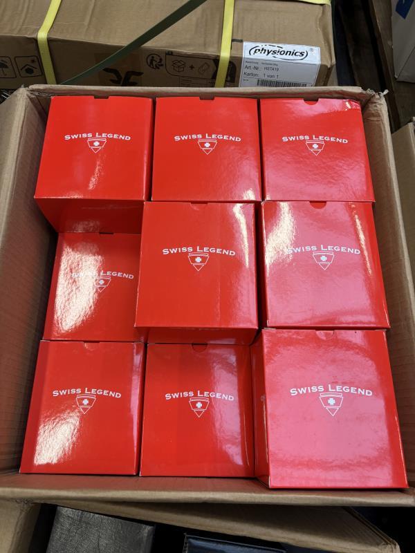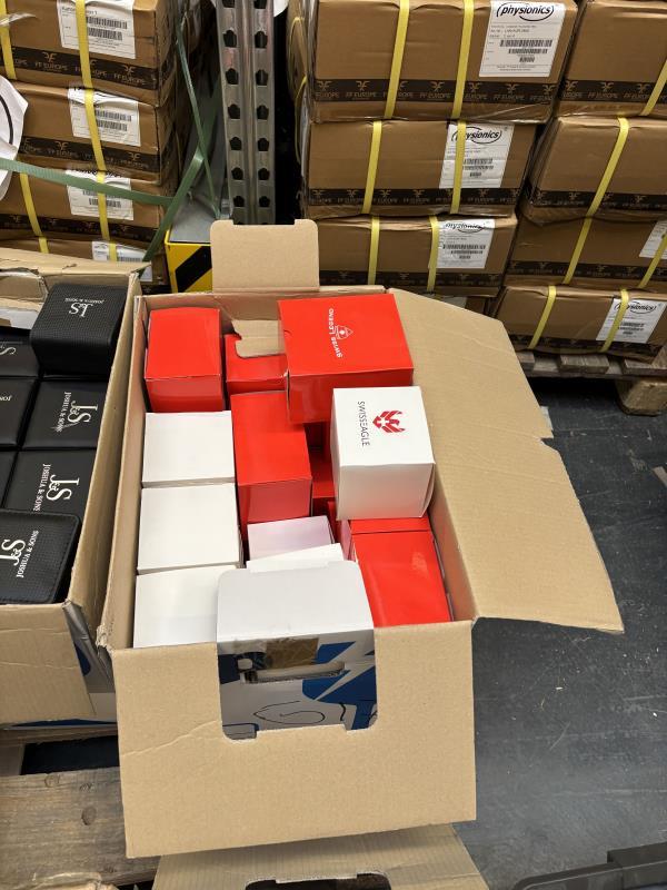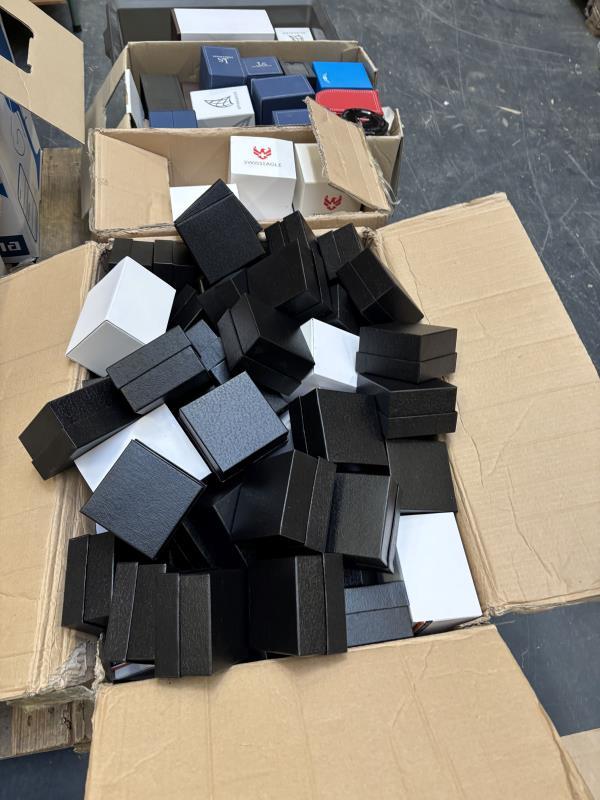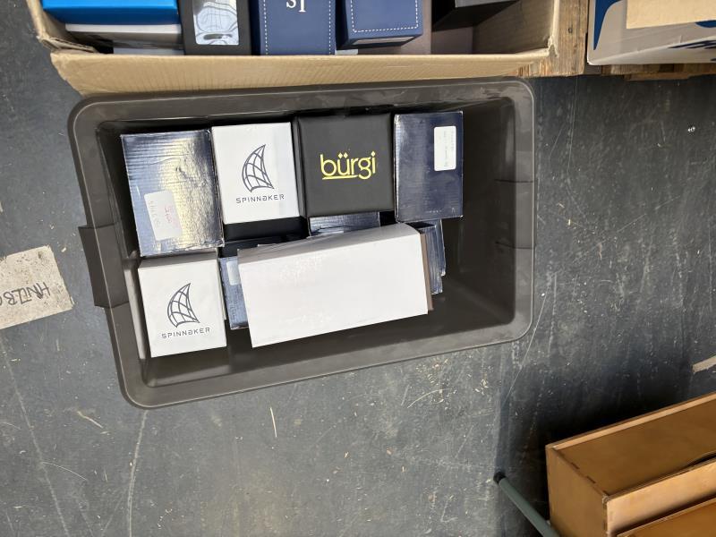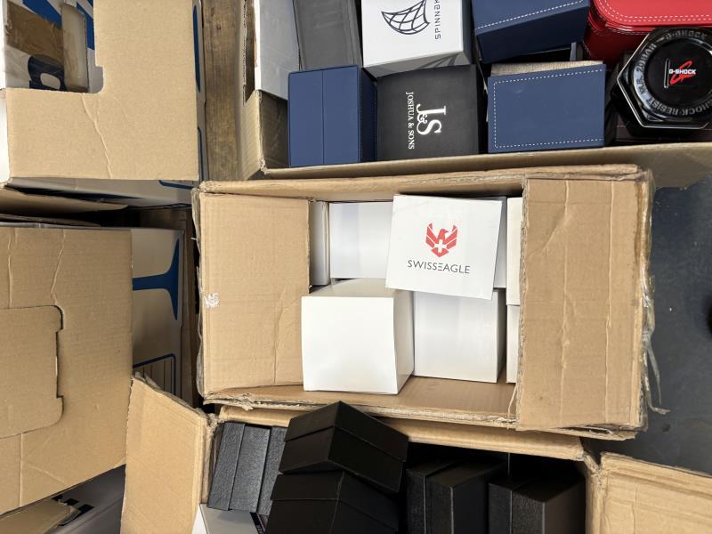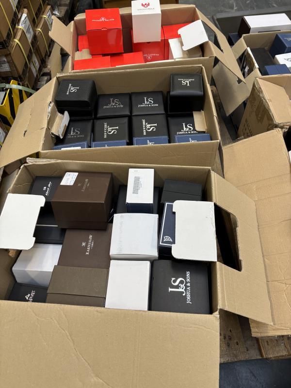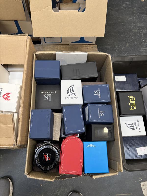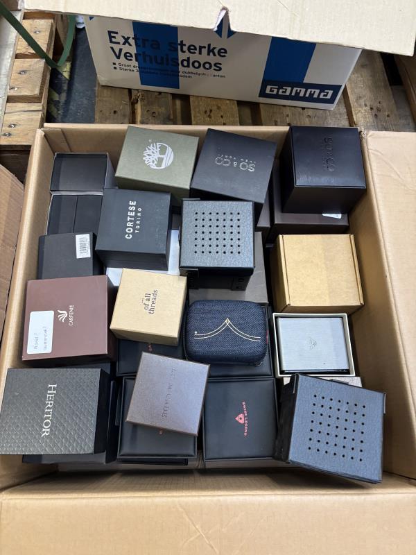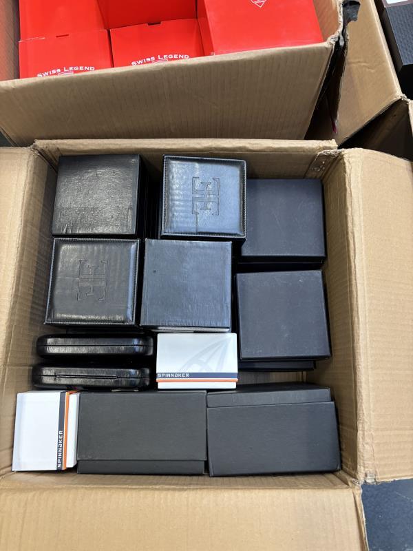 1 grote partij met lege horlogedoosjes in 11 dozen w.o. Swiss Eagle, Joshua & Sons, Swiss Legend, Spinnaker, juwelendoosjes, Earnshaw,Cortese etc.