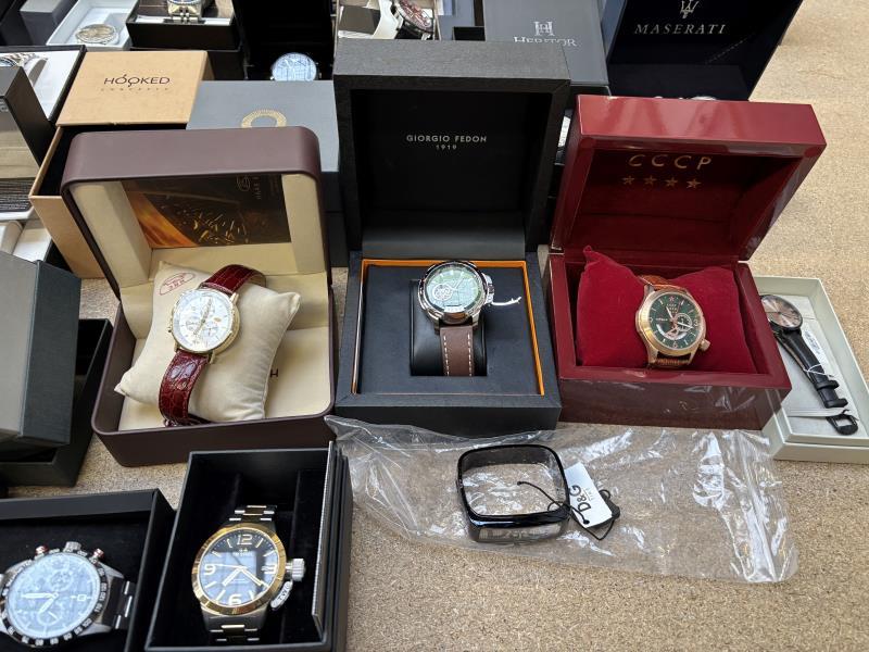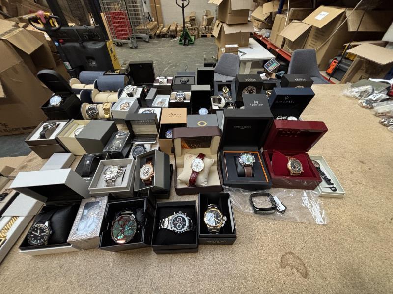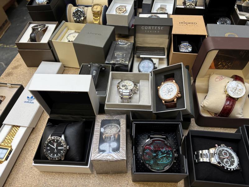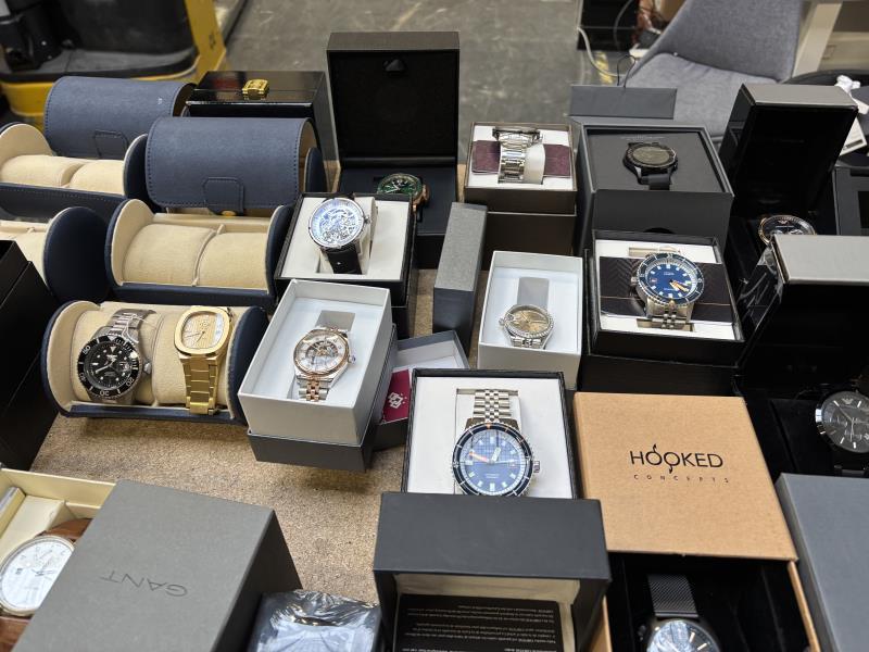 1 doos met ca. 45 stuks horloges w.o. Armani, Vector, Seiko, Maserati, Versace, Gant, Dolce Gabbana, Empress, Cortese, Diesel, in diverse kleuren, materialen en merken. Dit betreft een partij horloges die deels retourgoederen zijn en deels ter reparatie aangeboden zijn. Werking onbekend.