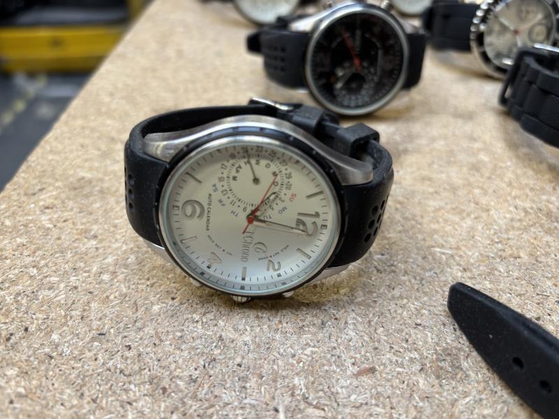 1 doos met ca. 28 stuks iChrono horloges diverse modellen en materialen. Dit betreft een partij horloges die deels retourgoederen zijn en deels ter reparatie aangeboden zijn. Werking onbekend.