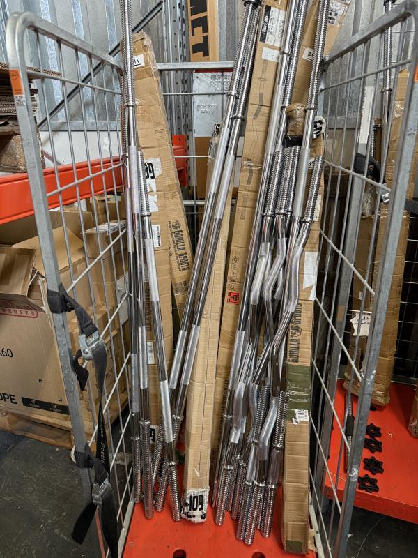1 rolcontainer met ca. 20 stangen w.o. halterstangen, aerobic halterstangen etc (excl. rolcontainer)
