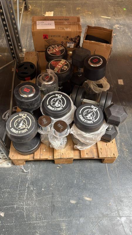 1 pallet met ca. 20 fitnessartikelen w.o. (chromen) dumbells, halterschijven en polsgewichten