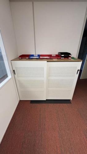 1 halfhoge schuifdeurkast, afm. ca. 160 x 120 cm. met inhoud