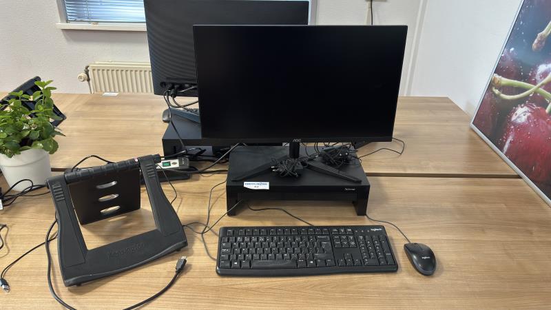 1 AOC monitor met Fellowes monitor standaard, toetsenbord en muis