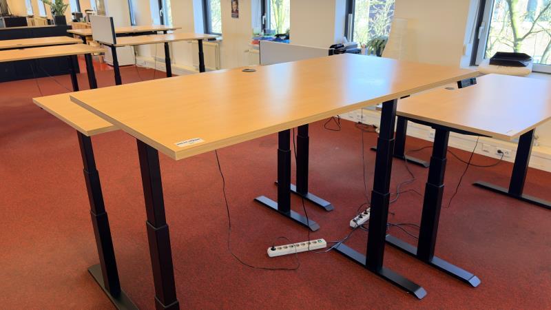 1 elektrisch i.h.v. bureautafel, afm. 160 x 80 cm, ahornkleurig houten blad, matzwart onderstel, max. hoogte 130 cm. 4 memory standen, afzluitbare kabeldoorvoer, USB oplaadpunt