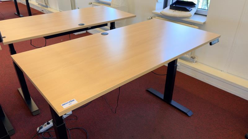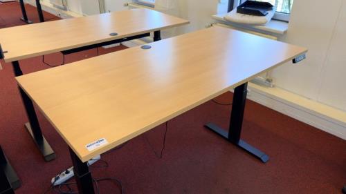 1 elektrisch i.h.v. bureautafel, afm. 160 x 80 cm, ahornkleurig houten blad, matzwart onderstel, max. hoogte 130 cm. 4 memory standen, afzluitbare kabeldoorvoer, USB oplaadpunt