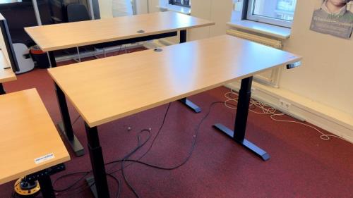 1 elektrisch i.h.v. bureautafel, afm. 160 x 80 cm, ahornkleurig houten blad, matzwart onderstel, max. hoogte 130 cm. 4 memory standen, afzluitbare kabeldoorvoer, USB oplaadpunt