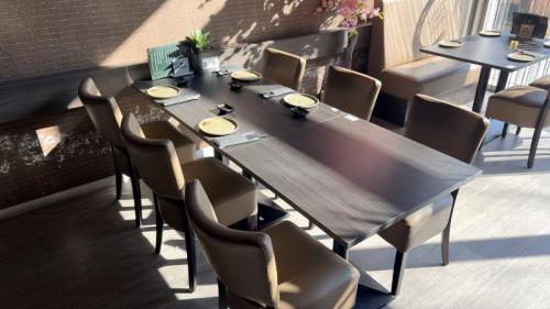 2 restauranttafels met 6 restaurantstoelen met lederen bekleding