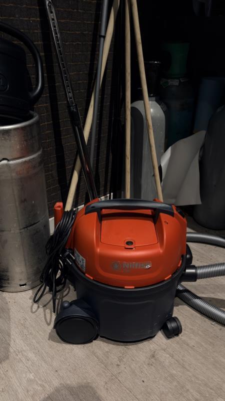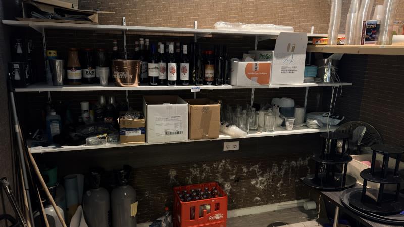 de inhoud van de stellingen w.o. glaswerk, wijnflessen, siroop, disposables, 4 koolzuurcylinders, 2 banners, nilfisk stofzuiger etc.