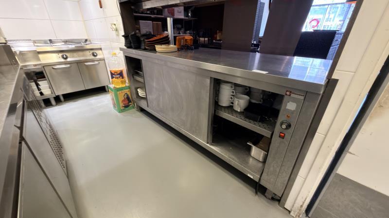 1 rvs warmhoudkast, afm ca. 200 x 70 cm. met serviesgoed en warmhoudbrug