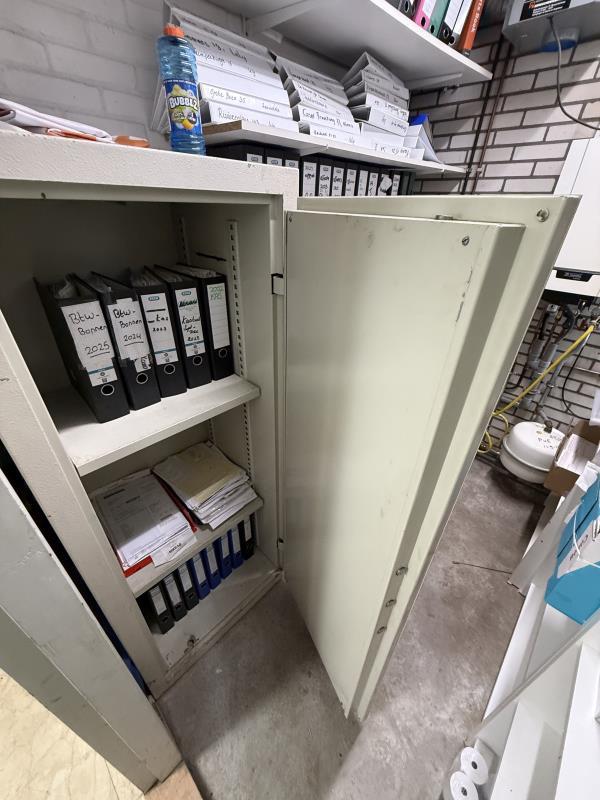1 brandwerende kast, afm 160 x 67 cm.