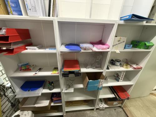 de inhoud van de vakkenkasten w.o. kantoorgerief en 2 beeldschermen