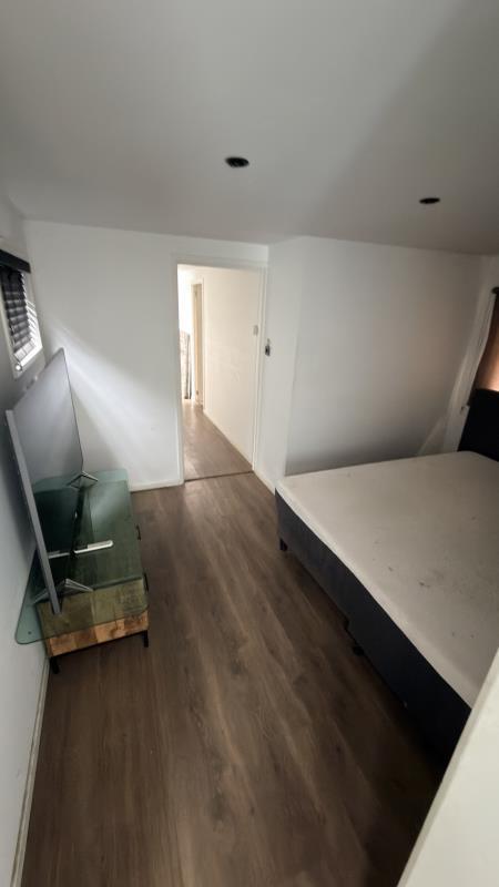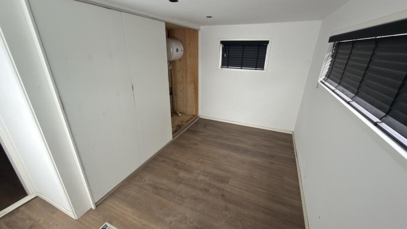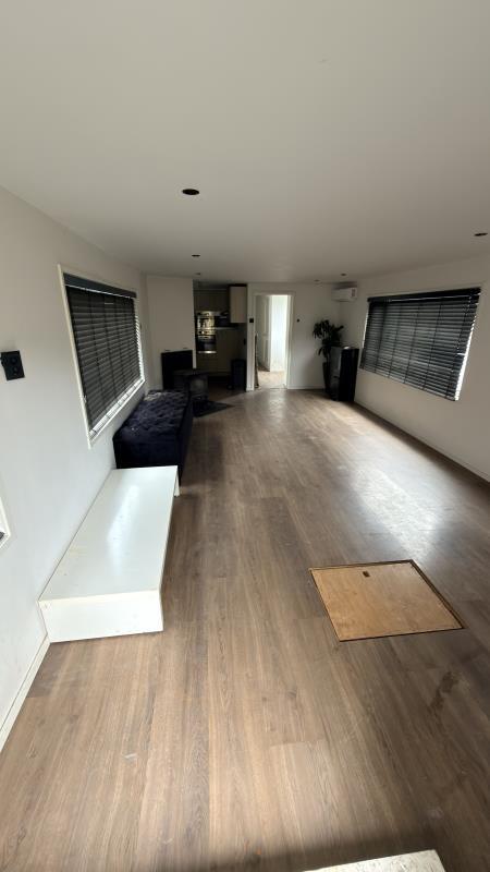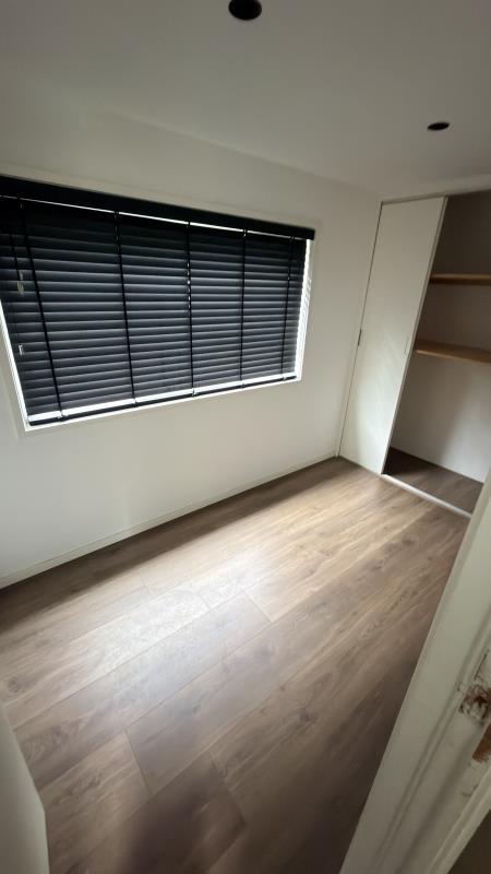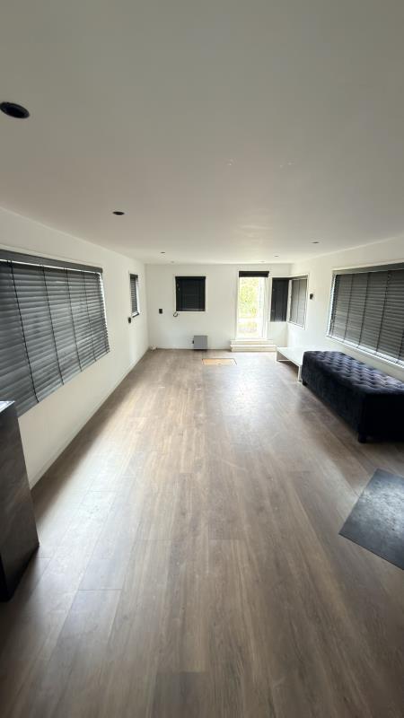 Binnen vind je een ruime woonkamer met meerdere raampartijen, wat zorgt voor veel daglicht. De ruimte is afgewerkt met een laminaatvloer, inbouwspots en jaloezieën, wat bijdraagt aan een nette en verzorgde uitstraling.